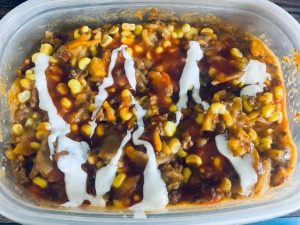 Lunch: Haystack with corn, buffalo sauce and ranch dressing.