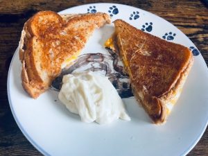 Breakfast: Coffee with creamer; Grilled cheese on Dave’s Killer Bread, White Bread Done Right with 3 thin slices of colby jack cheese and horseradish/mayo mix.
