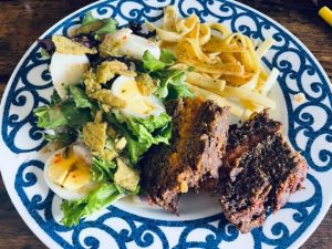 Lunch: Leftover mozzarella stuffed meatloaf from last night, salad with 1 hard egg sliced, crunchy jalapenos, red onions, italian dressing and buttered noodles