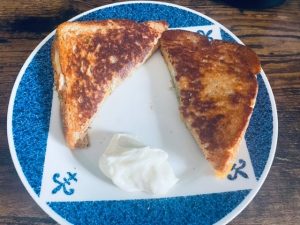 Breakfast: Coffee with creamer; Grilled cheese on Dave’s Killer Bread, White Bread Done Right with 3 thin slices of colby jack cheese, fresh dill from the Aerogarden and horseradish/mayo mix.