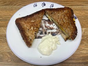 Breakfast: Coffee with creamer; Grilled cheese on Dave’s Killer Bread, Everything Epic Breakfast Bread with 3 thin slices of colby jack cheese, f and horseradish/mayo mix.