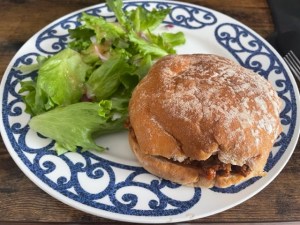 Lunch: Salad with onions, Italian dressing. Leftover sloppy joes on a Dave’s Killer Bread white bun. Not shown is roasted potatoes with ketchup.