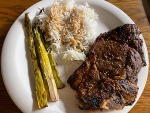 Dinner: Steak, basmati rice with soy sauce, asparagus.
