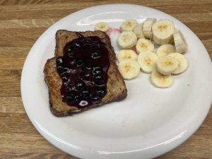 Breakfast: Coffee with creamer. Dave’s Killer Bread Breakfast Bread made into french toast (I used 2 eggs, almond milk and cinnamon for the mix) and the blueberries were put into a microwave safe bowl with lemon juice, monk fruit sugar. Once it was heated, I added a little bit of corn starch to thicken the sauce. I also sliced up a banana.