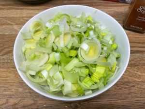 - Clean the leeks and green onions – dice up and place in a bowl to set aside.