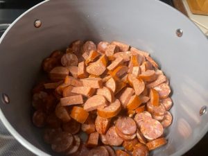 - If you are making the soup right away, place a large pot on the stove, with olive oil drizzled on the bottom. Add the sausage with smoked paprika and minced garlic to start browning. I put mine on high heat so that it would give a dark color to the sausage.