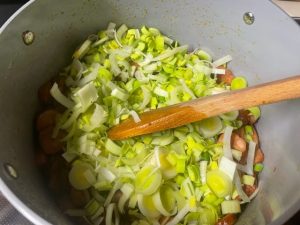 - Stir the leeks and onions in with the sausage and continue to cook.