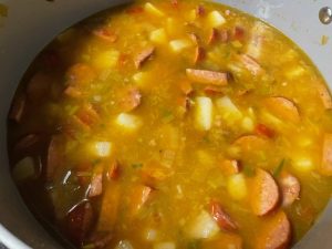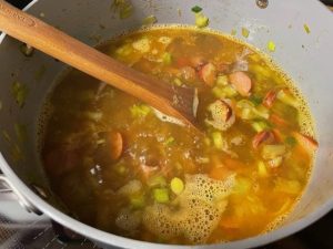 - The chicken broth should be hot by this time. Carefully add this to the sausage, leeks and green onions in the large pot.