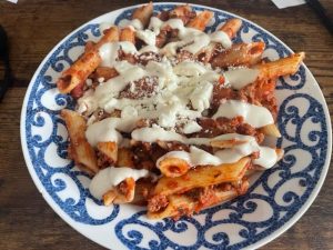Lunch: Leftover pasta from last night with feta cheese on top and ranch dressing.