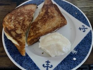 Breakfast: Coffee with creamer. Grilled cheese with onions on Dave’s Killer White Bread Done Right with a horseradish/light mayo.