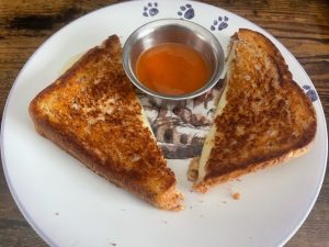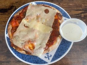 Breakfast: Coffee with creamer. Pita pizza with ranch; Grilled cheese on Dave’s Killer White Bread Done Right with Cairo BBQ sauce.