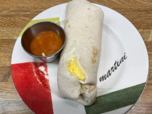 Breakfast: Coffee with creamer. 2 eggs with swiss cheese on a burrito and cairo BBQ sauce.