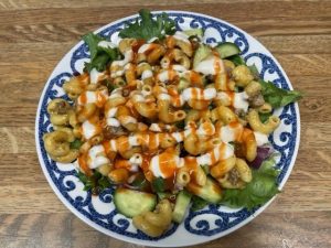 Lunch: Salad with red onions, cucumbers, leftover homemade hamburger helper, ranch and buffalo sauce drizzled on top.