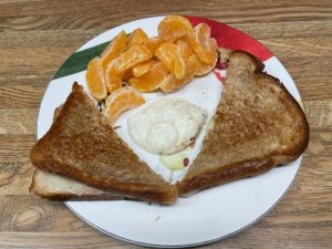 Breakfast: Coffee with creamer. Two grilled cheese on Dave’s Killer Bread White Bread Done Right with horseradish/mayo and two clementines.
