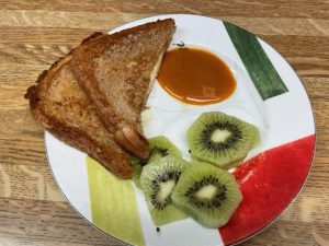 Breakfast: Coffee with creamer. Grilled cheese on Dave’s Killer White Bread Done Right with thin colby jack cheese slices and Cairo BBQ Sauce. One kiwi as well.