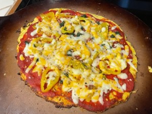 Lunch: Spaghetti squash crust pizza with homemade marinara sauce, spinach, and banana peppers. Colby Jack cheese on top with seasonings. Salad with cucumbers, onions, feta cheese and Italian dressing.