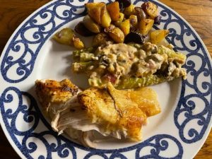 Dinner: Rotisserie chicken, divine asparagus (asparagus, 1/2 block cream cheese, 1/2 cup light mayo, 1/3 cup parmesan cheese, red onion sliced, mushrooms diced), roasted potatoes