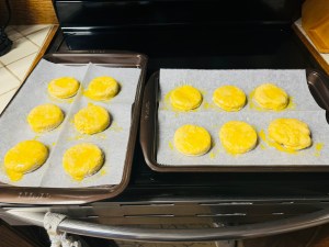 - Once all of the biscuits are on the cookie sheets, use a basting brush to brush the whisked egg on top.