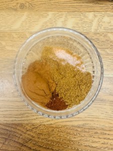 - In a small dish, mix the salt, black pepper, chili powder, ground cumin, and cinnamon.