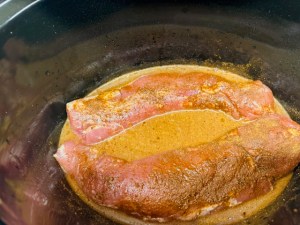 - In the crockpot, or 9 x 13 baking dish, add the pork tenderloin, then rub the dry seasonings on them. I ended up doing this on all sides of the tenderloin. I added beer to the bottom of the crockpot so that there would be some type of liquid, but you can also use water.