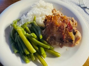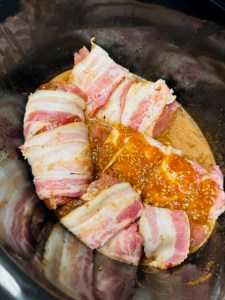This is inspired by the Island Pork Tenderloin recipe that is in the P90X recipe book. There are 2 ways you can make this – in the crockpot or in the oven. The bacon is optional. With using the crockpot, this was ready in 5 hours on the low setting.