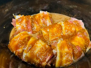 - Add the brown sugar, minced garlic & hot sauce mixture to the top of the bacon wrapped tenderloins.